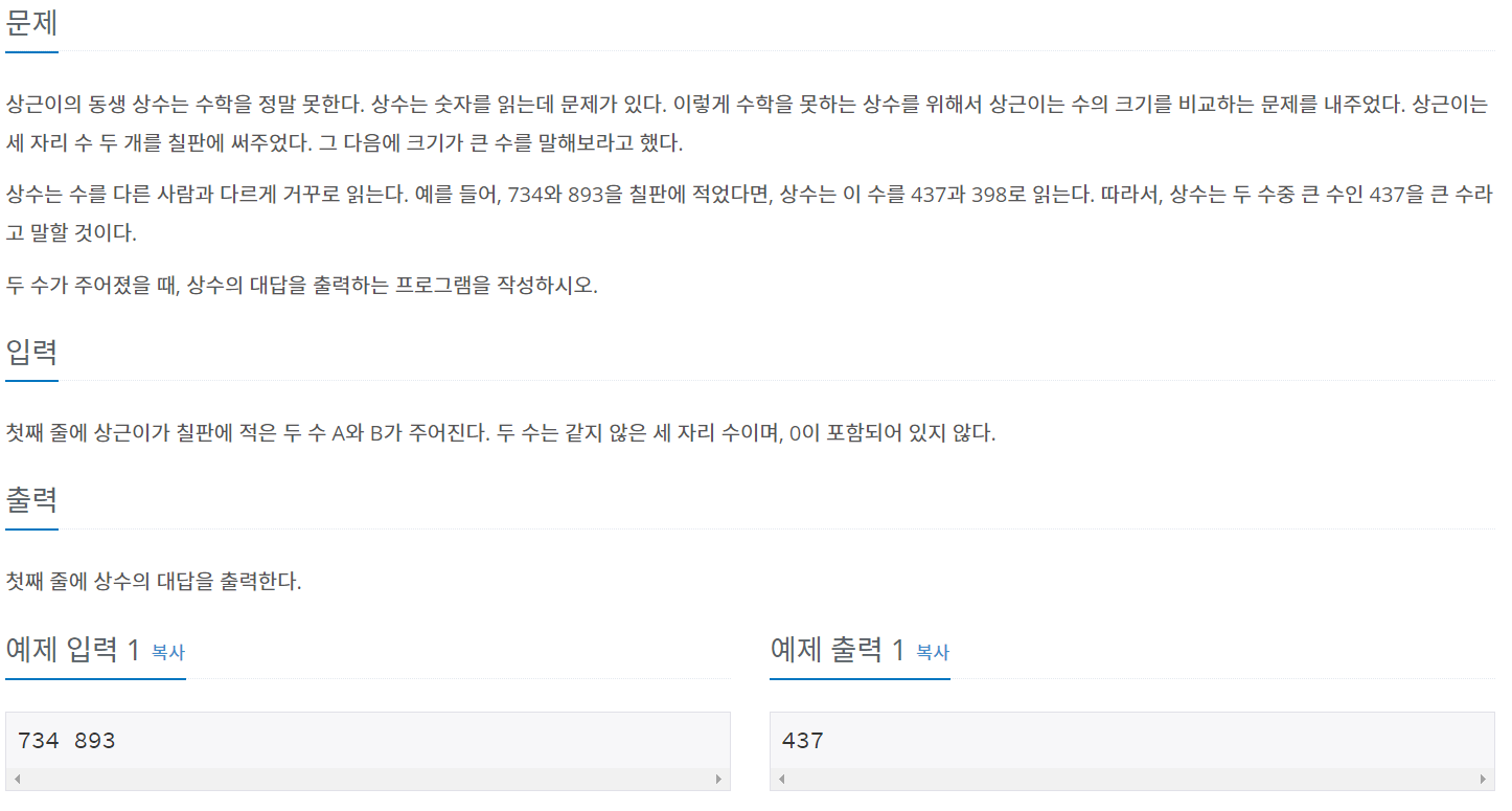 상근이의 동생 상수는 수학을 정말 못한다. 상수는 숫자를 읽는데 문제가 있다. 이렇게 수학을 못하는 상수를 위해서 상근이는 수의 크기를 비교하는 문제를 내주었다. 상근이는 세 자리 수 두