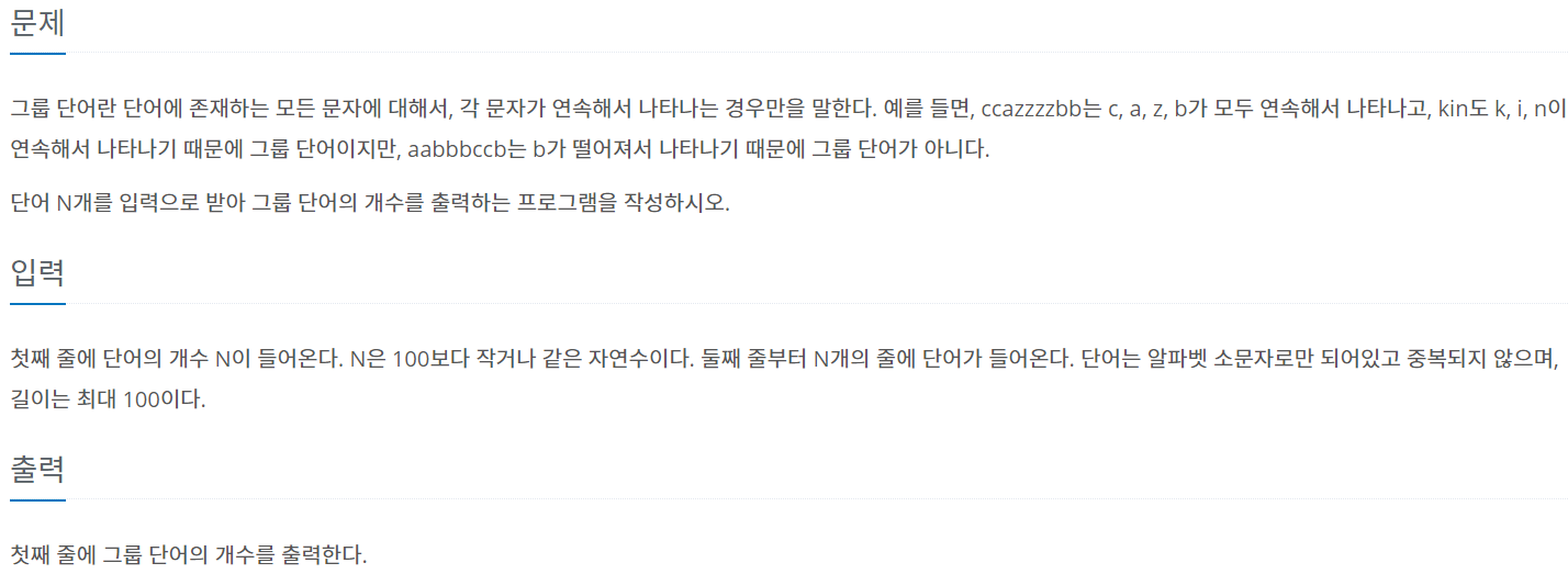 그룹 단어란 단어에 존재하는 모든 문자에 대해서, 각 문자가 연속해서 나타나는 경우만을 말한다. 예를 들면, ccazzzzbb는 c, a, z, b가 모두 연속해서 나타나고, kin도 k, i, n이 연속해서 나타나기 때