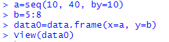 +) x=c(1,2,3,4,5,6,7,8,9,10), x1=seq(1, 10), x2=1:10는 저장된 것이 같다.