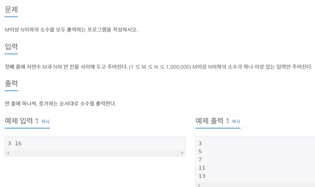 첫째 줄에 자연수 M과 N이 빈 칸을 사이에 두고 주어진다. (1 ≤ M ≤ N ≤ 1,000,000) M이상 N이하의 소수가 하나 이상 있는 입력만 주어진다.