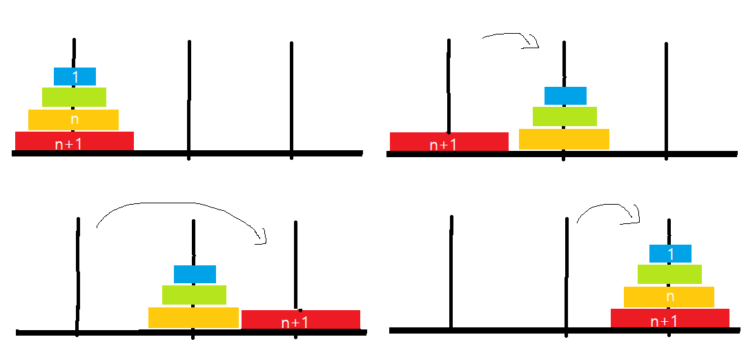 n+1개의 원판이 있을때, n개를 2번에 옮기고