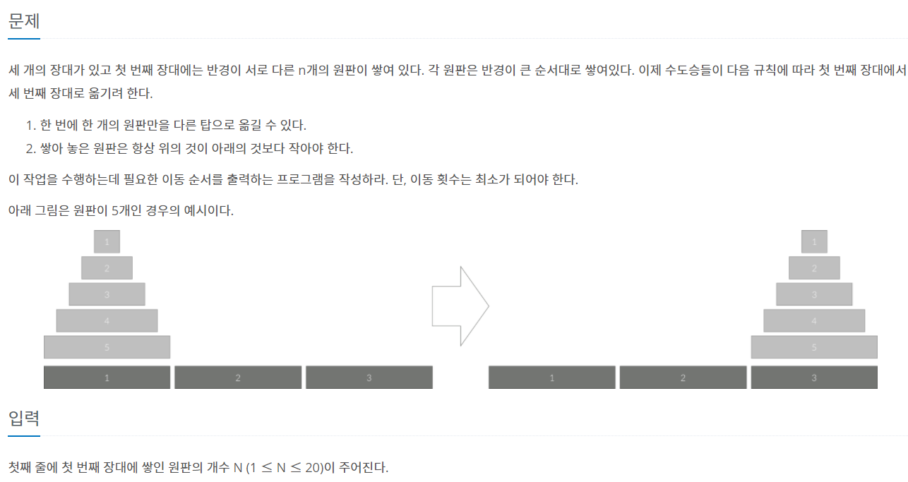 세 개의 장대가 있고 첫 번째 장대에는 반경이 서로 다른 n개의 원판이 쌓여 있다. 각 원판은 반경이 큰 순서대로 쌓여있다. 이제 수도승들이 다음 규칙에 따라 첫 번째 장대에서 세 번째 장대로