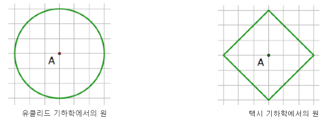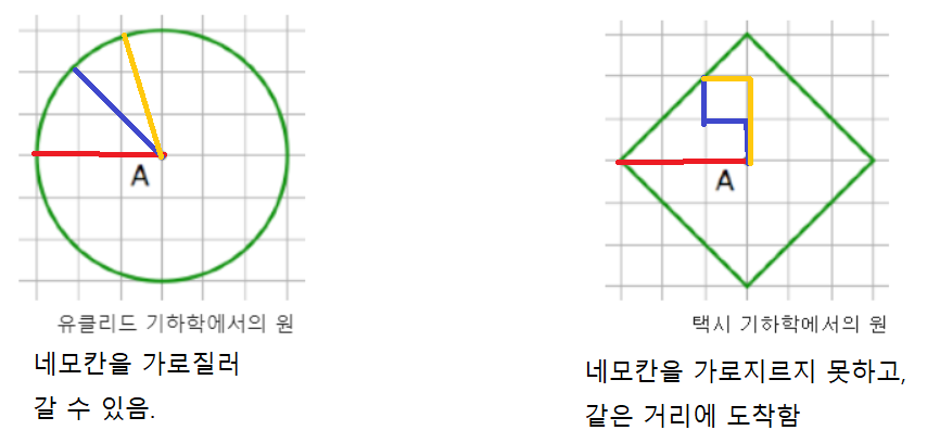 택시 기하학은 유클리드 기하학과 다르게 가로질러 가지 못한다.