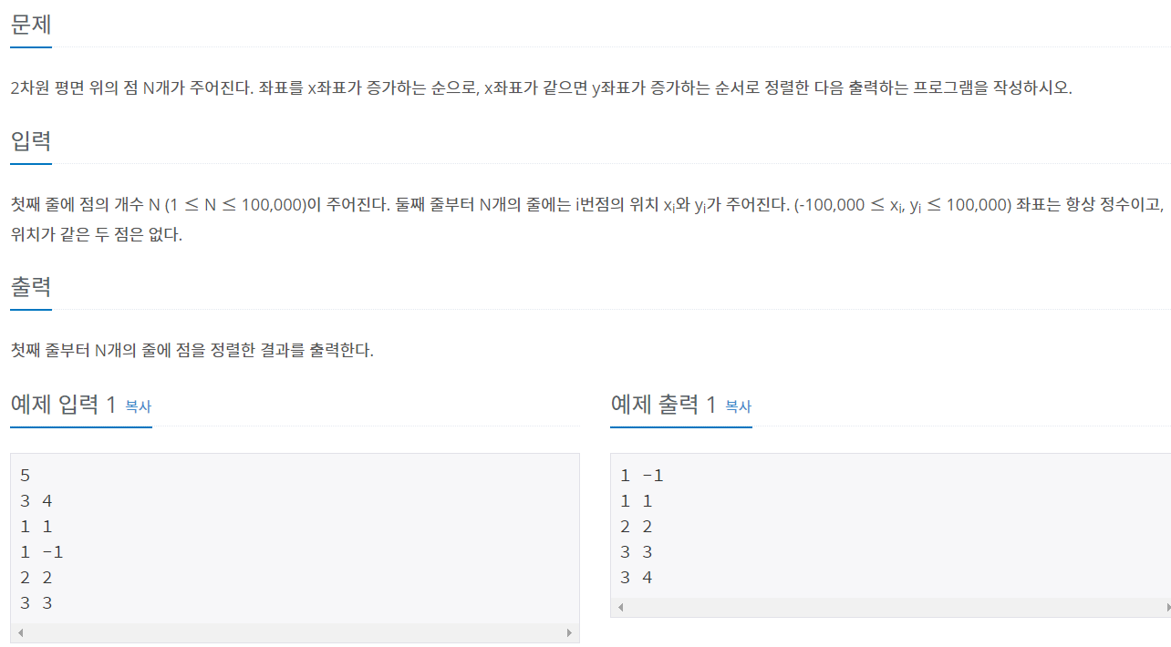 위와 같은 식으로 풀면 되는 11651번 문제를 같이 풀어봤다. 이번엔 y값를 먼저 오름차순 한 후, y값이 같을 때 x값을 오름차순으로 정렬해줘야 한다. (람다식 부분만 좀 다르니 살펴보자)