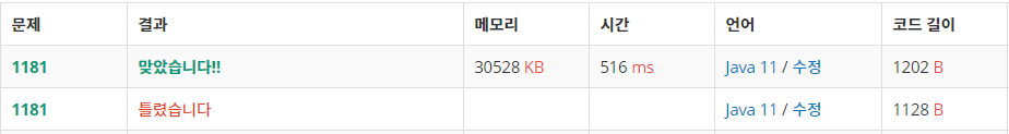 길이가 같으면 알파벳순인데 처음에 s1과 s2의 charAt(0)만 비교해서 틀림