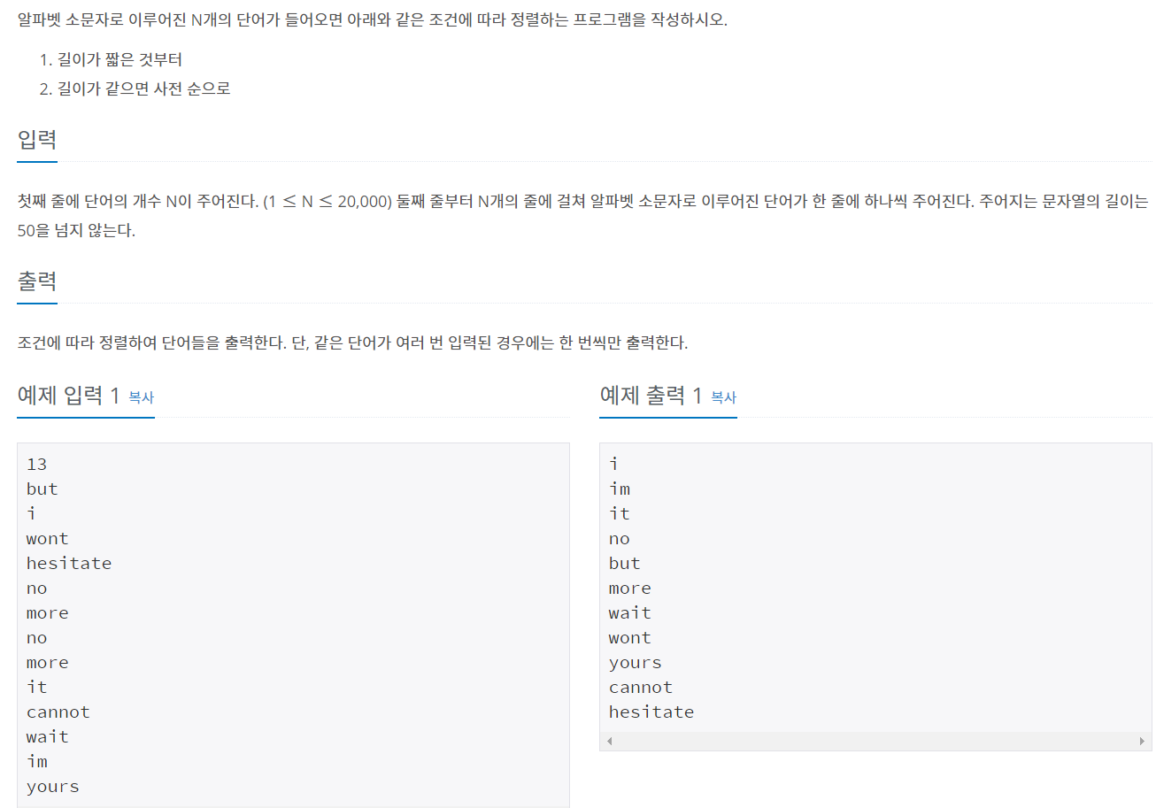 즉, 길이가 짧은게 먼저 나오도록 하고 길이가 같다면 알파벳순으로 정렬해라.