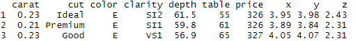 head(diamonds, 3) #첫번쨰 줄 부터 3줄까지 보여줌