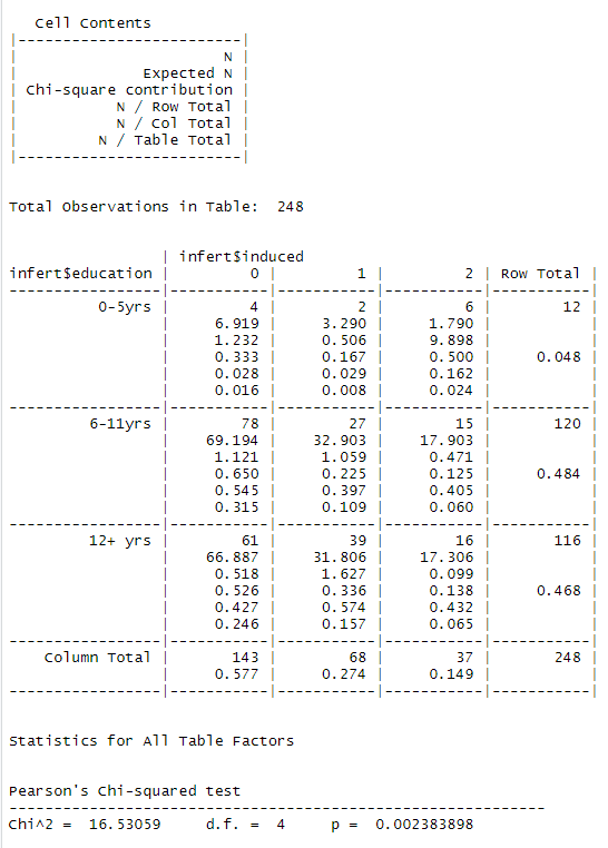 CorssTable(infert$education, infert$induced, expected=TRUE, format="SAS")